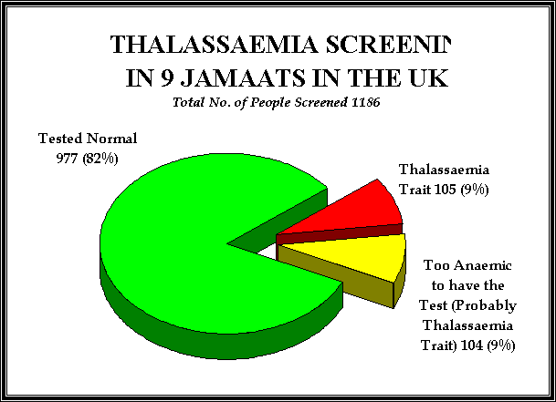 These results suggest that over 9 out of 100 people in our community are definitely Thalassaemia trait carriers.  This figure is possibly higher - as high as over 18 out of 100.  If 2 carriers marry, their children will have a 25% chance of producing children with Thalassaemia Major.  This would be major disaster for them as well as for the affected child.