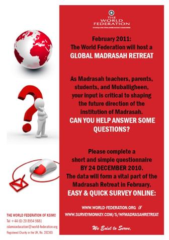 The Islamic Education team requests Madrasah teachers, parents, students, and Muballigheen to assist with the collection of data around the Madrasah. A short and simple questionnaire that will take only minutes to complete has been designed. The data will form a vital part of the Madrasah Retreat in February. The deadline for completion of the questionnaire is 24 December 2010.