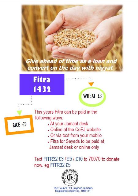 A unique text code FITR32 £3/£5/£10 is used to donate the FITRA payment by texting 70070 e.g. FITR32 £5. The text message is free and all the funds will go directly to CoEJ who will channel the funds to WF.