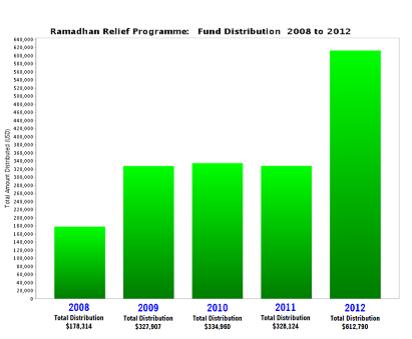 The chart below shows the total sum of Ramadhan Relief Funds allocated to both Sadaat and Non-Sadaat families each year since 2008. The total distribution (including Sadaat and Non-Sadaat) for 2012 are the highest we have committed to since the fund was launched.