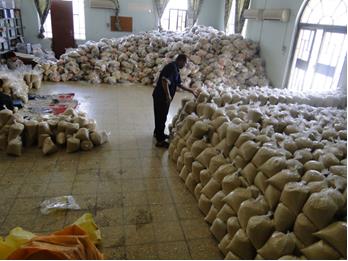 Before the start of the Month of Ramadhan, food parcels including dry rations were purchased in bulk and packaged for delivery. Volunteers have been working long hours preparing the food baskets.