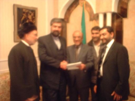 Dr. Ahmed Hasam, President of World Federation handing over our contribution to H. E. Agha Murtaza Sarmadi.