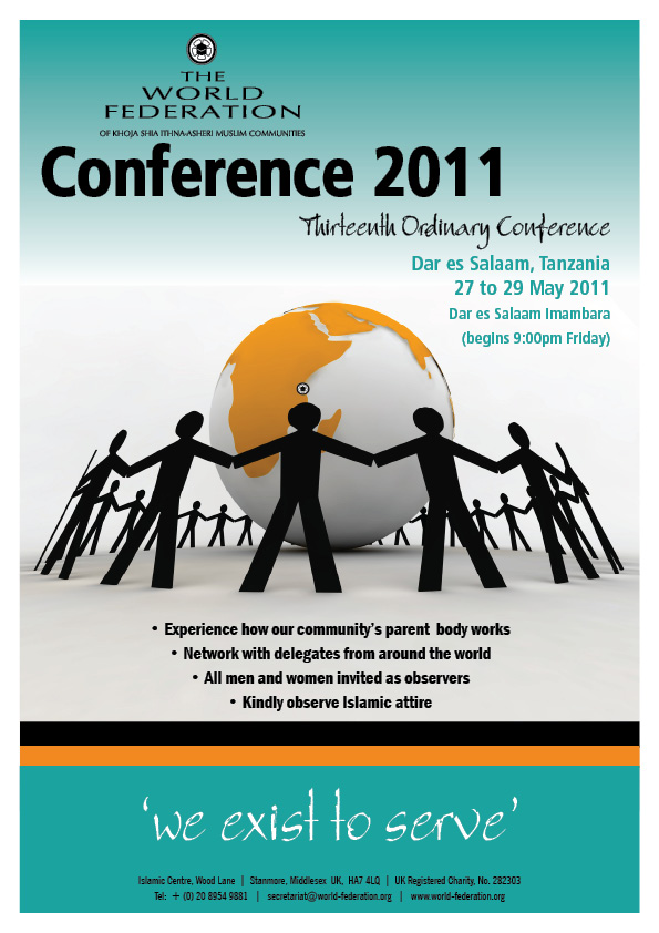 By the Grace of Allah (SWT), we are blessed to have a community that is engaged, concerned and visionary. The Thirteenth Ordinary Conference of The World Federation of KSIMC will take place between 27 and 29 May 2011 in Dar es Salaam Tanzania. This is a time when leaders of various positions in our global communities come together to reflect on the past term’s achievements, discuss current challenges and chart a way forward for the next term. Working hand in hand with our community leaders allows The World Federation to carry the spirit of unity and brotherhood far beyond our doors.