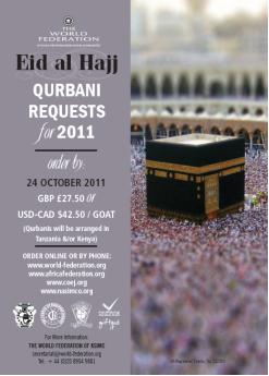 Whilst Qurbanis can be arranged year round, the closing date for those wanting it done on time for Eid al-Hajj is 24 October 2011.