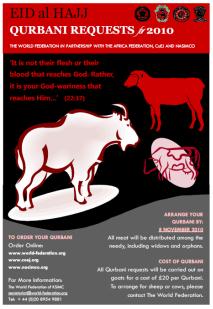 Whilst Qurbani can be arranged year round, the closing date for those wanting it done on time for Eid al-Hajj is 10 November 2010.