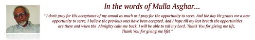 Mulla-Asghar.org has been launched in his memory, not only to preserve the years of his life, but to provide an opportunity to ponder over the words of wisdom that he repeated time and time again, and to act upon his since advices, that he told us with an intention to see a community grow and follow in the footsteps of the A'immah (a.s.)