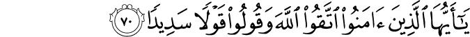 Sura Ahzab (33:70) O you who have attained to faith! Remain conscious of God, and [always] speak with a will to bring out [only] what is just and true.
