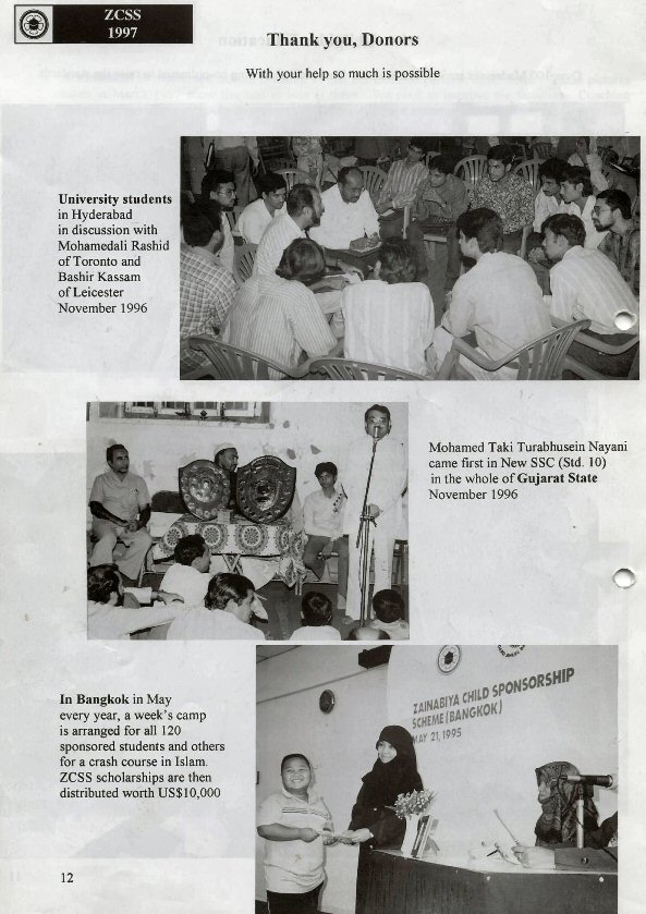 A large delegation from several countries toured India in November 1996 and reported back to the Chairman of ZCSS, Muhsin Dharamsi.  The reports of Haji Mohamedali Rashid of Toronto and Haji Akberali Panjwani of Essex were particularly helpful.